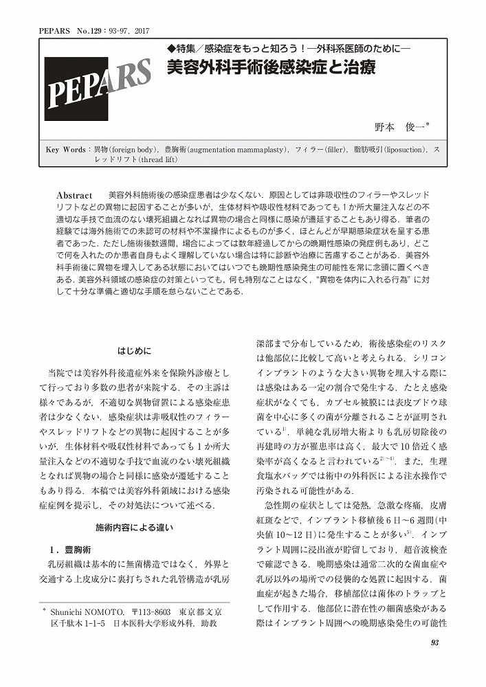 PEPARS No.129 感染症をもっと知ろう! -外科系医師のために- 「美容外科手術後感染症と治療」 |