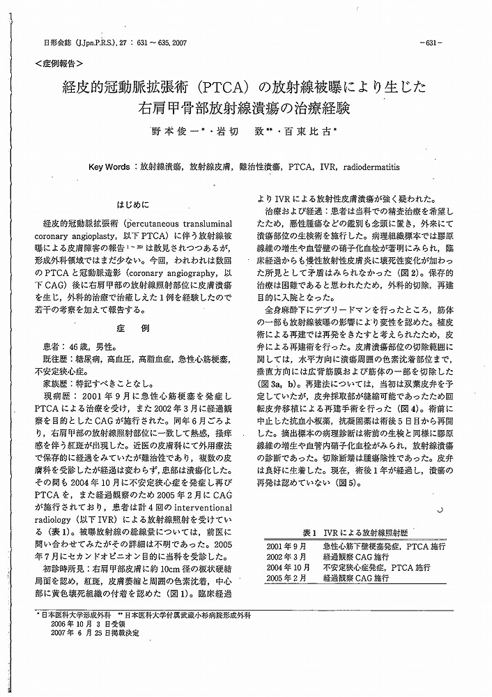 日本形成外科学会会誌Journal of Japan Society of Plastic and Reconstructive Surgery, 27(9), 631-635. 「経皮的冠動脈拡張術(PTCA)の放射線被曝により生じた右肩甲骨部放射線潰瘍の治療経験」 |